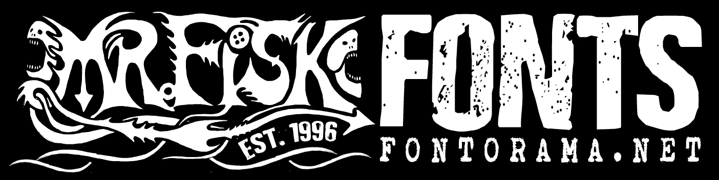 While the fonts above represent my curated ‘Best Of’ collection and my new ones, the Mr. Fisk archive is vast. Other titles released throughout three decades of design include: A dark wedding, After dying, Alienoid flux, An irritating speck, Are you awake Neo?, Bodybag, Brain damage, Coagulate, Colour blind, Crap music, Dancing dead, Dead postman, Division X, Dr Benway, Dr. Enoksen, Evil mail, Faded moviestar, Fingered flesh, Fisk Bitmap, German underground, Hair of the dog, Head injuries, In the flesh, Jack the ripper, Little insect from another planet, Megalomania, Mr Fisk Coke, My biopsy, Naive font, Note of terror, PeepShow, Punk rock font, Satanas Humanum salvator, Sinking ship, Space ship 354, Suicide, Swede trauma, Sweet torture, NothingNet, Terror, The end, The evil cop, The worms, Times-new-zooman, Tired terrorist, Transcript, Underwater, Zombie noize, and more.